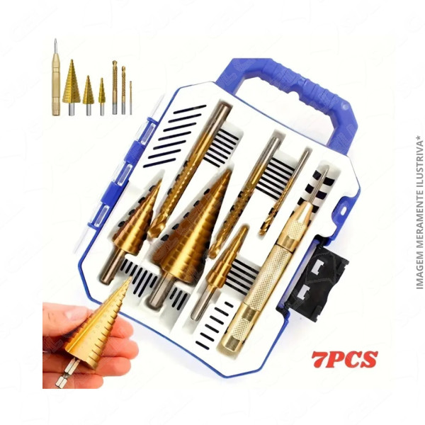 | Nome | Broca Conica Escalonada Aço Rapido Espiral Kit c/ 7 Pçs (KA-6581) |